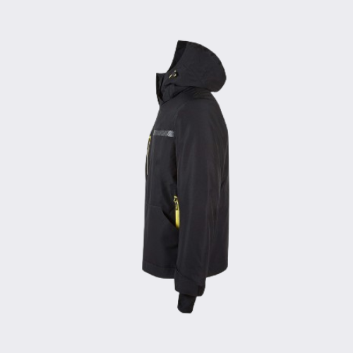 Giacca con cappuccio fisso regolabile con coulisse elasticizzata e zip centrale. Giacca idrorepellente con collo interno in morbido microfleece e fondo dritto regolabile con coulisse interna.